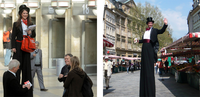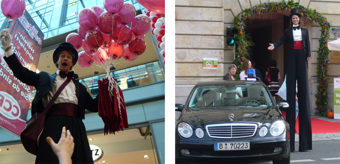 Sie möchten die Gäste Ihrer Veranstaltung auf eine besondere Art und Weise begrüßen? Dann sind unsere Stelzenartisten das Highlight für Ihr Event. Gerne verteilen unsere Stelzenläufer auch Ihre Give Aways.